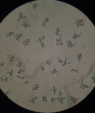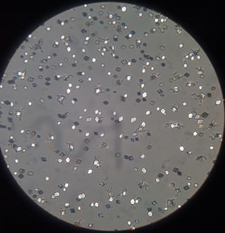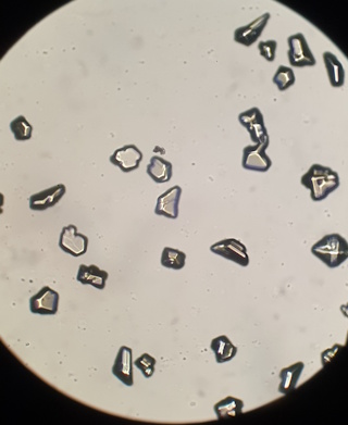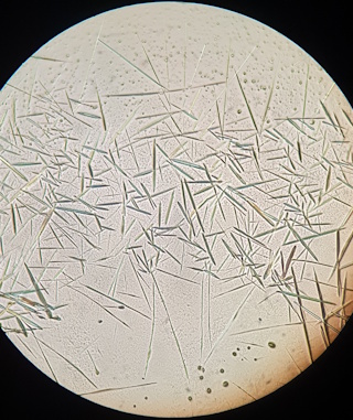 Benzoëzuur begint te sublimeren rond de 100 °C. Insteltemperatuur: 105 °C Waterverdamping was niet zichtbaar bij dit preparaat. Kristalvorm: Monoklien De gevormde kristallen zijn voornamelijk prismatisch. |
