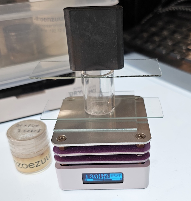 | Kristallen kweken via sublimatie probeer ik al langer. Om dat een beetje gecontroleerd te doen is niet echt gemakkelijk. Ik blijf daarom sleutelen aan mijn proefopstelling. Hieronder mijn laatste iteratie. |