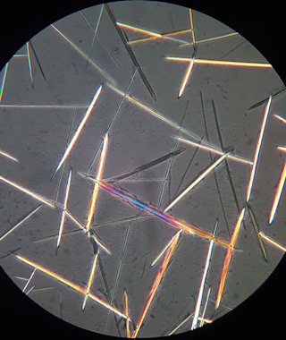 Het hydraat van cafeïne (coffeïne) begint te sublimeren bij 178 °C. Insteltemperatuur: 205 °C Waterverdamping was zichtbaar bij dit preparaat. Kristalvorm: monoklien De gevormde kristallen zijn naaldvormig. |