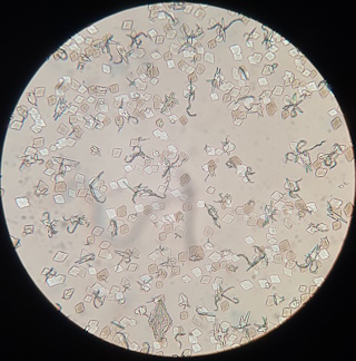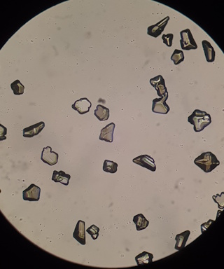 Benzoëzuur begint te sublimeren rond de 100 °C. Insteltemperatuur: 105 °C Waterverdamping was niet zichtbaar bij dit preparaat. Kristalvorm: Monoklien De gevormde kristallen zijn voornamelijk prismatisch. |